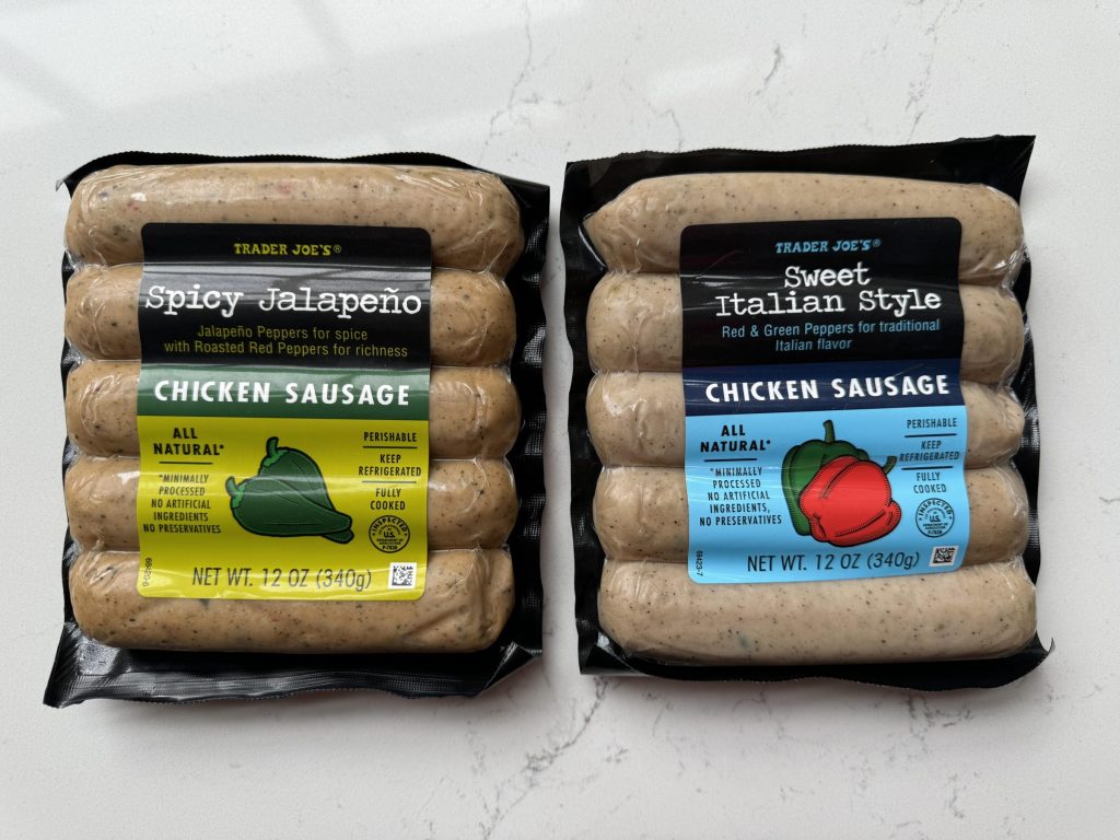 One of my favorite summer suppers is grilling sausages and then just adding sides. Trader Joe’s has a HUGE selection of sausages, and this week, I picked up these two packs for an easy dinner with grilled corn on the cobb, a salad and guacamole.