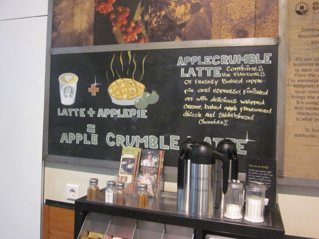 Oh heavens! As soon as our plane touched down, we were walking to baggage claim and I saw this at Starbucks…in Europe, they have a Apple Crumble Latte! What?! Yes, I had to stop for one. It was a fall delight. Maybe next year, they’ll bring it to the US. It was yummy!