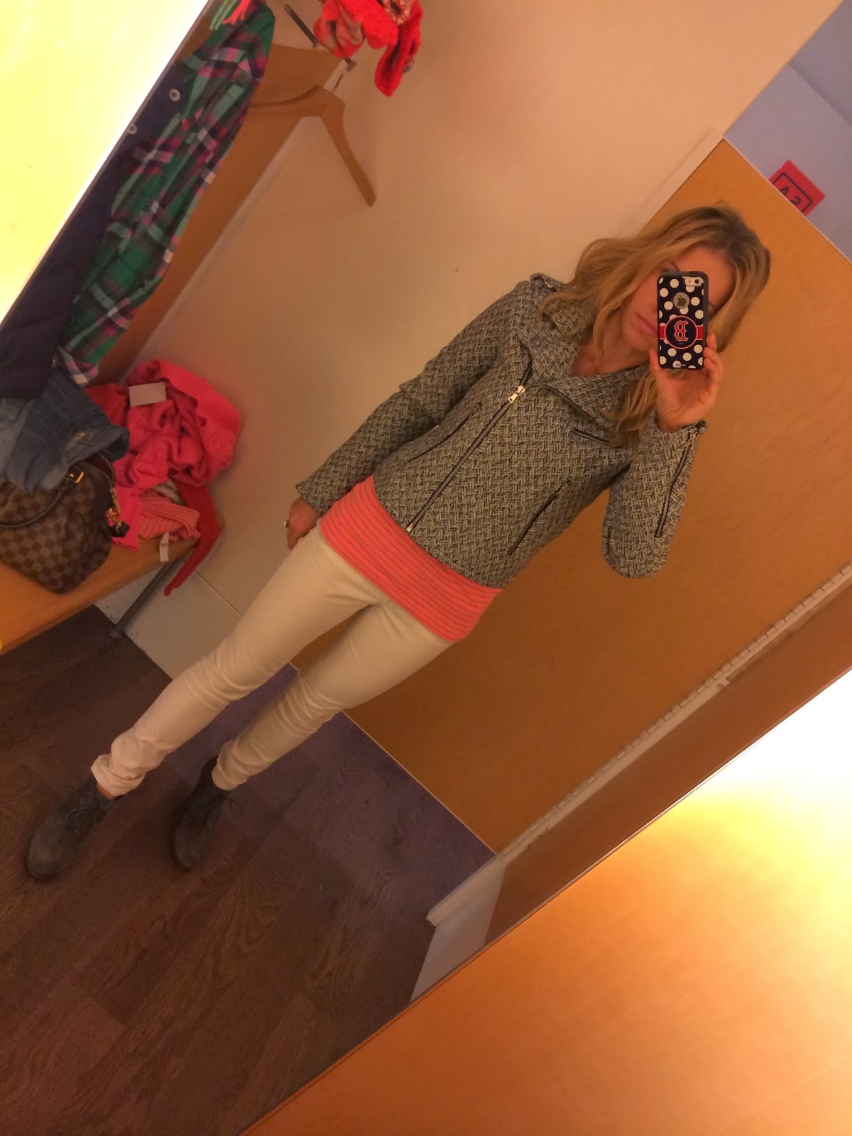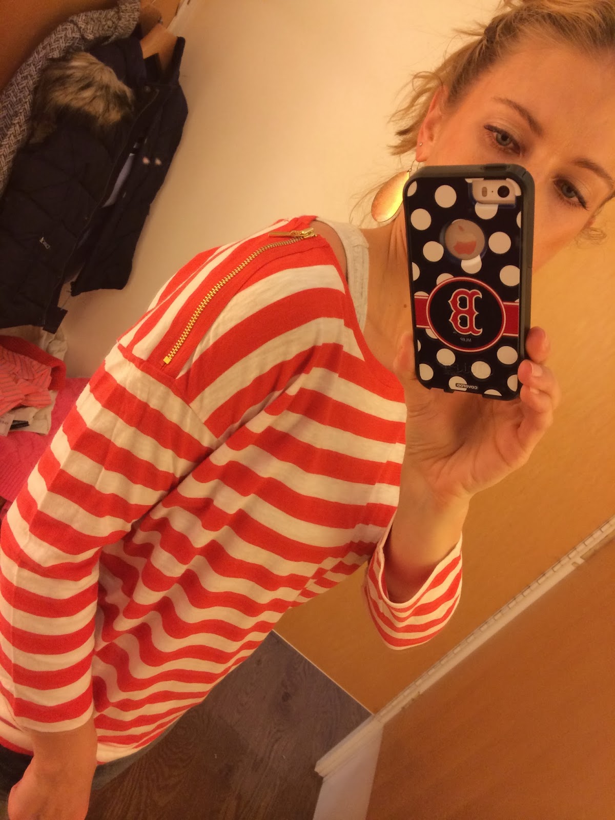 I wear mostly Stella & Dot earrings (a post on that Friday!!!), as for the jacket, I bought a small! And they might have already sold out of the pink and white stripe…it will be there if they still have some!