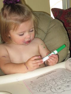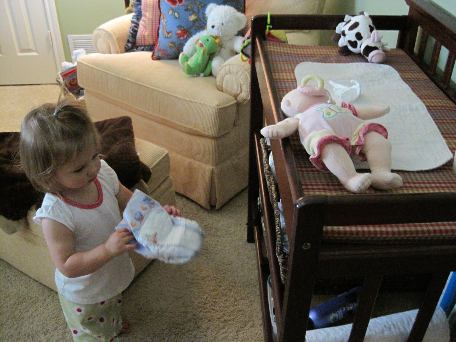 Kensington has really started “playing” lately. I’ll hear her talking to her babies like I talk to Smith and really interacting with them like a little mommy. This morning was all about changing her baby’s diaper. I kept hearing her in there saying “shuey baby, dirty diaper” and then she’d say “all clean” after she “changed” her baby. That’s pretty much how I talk to Smith. It’s just so cute to see her be a little mommy!