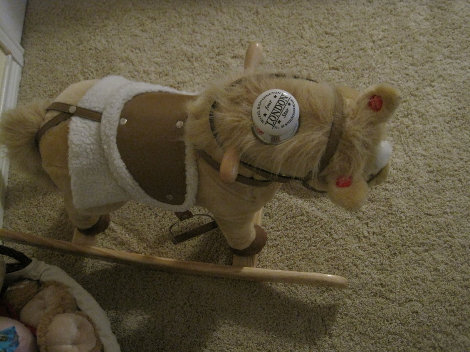 And this is random but I had to post it. A few weeks ago, my friend Aubrey blogged about how her daughter Ella puts things in certain places throughout the day. To date, it’s my favorite of her posts because it’s so funny to see how methodical these kids can be. A few days ago, I noticed that Kensington is taking an antique door knob off her dresser and setting it on her rocking horse’s head. I haven’t caught her doing it but it happens several times a day. I’ll go in there, put it back up and then go back and it’s on the head again. Since this picture was taken 3 hours ago, she’s done it two more times. We don’t really play in her room, so she’s making a special trip in there just to put the knob on the horse’s head. Why?????