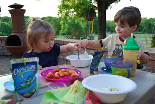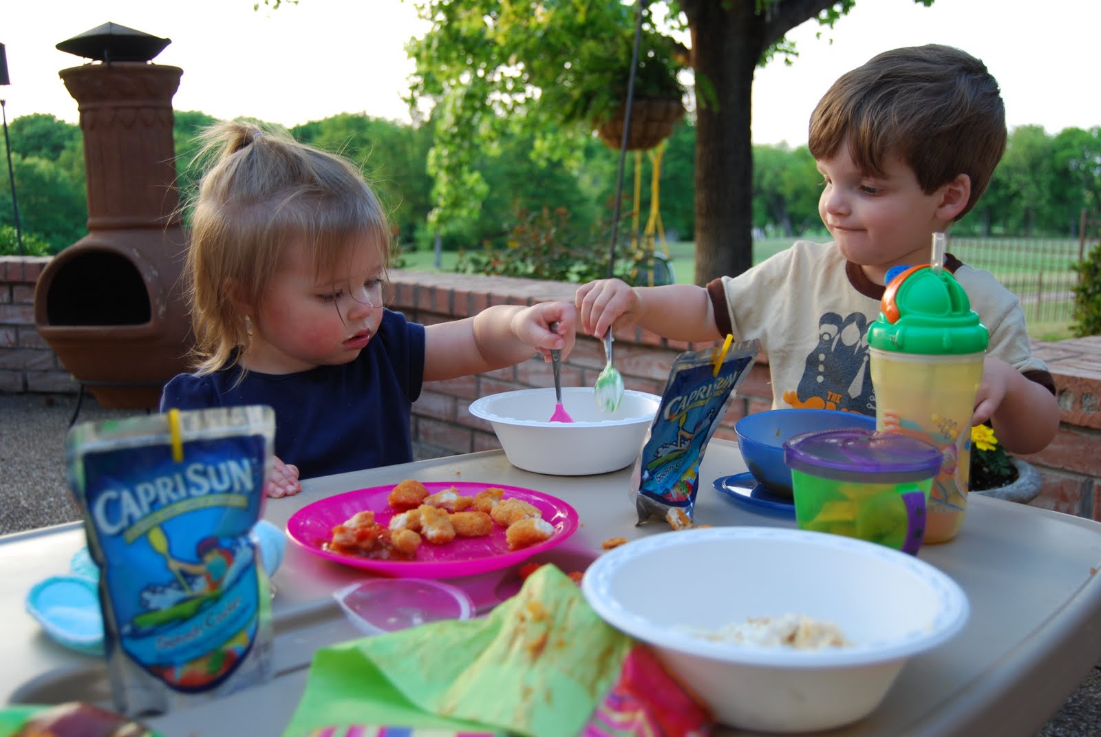 I think Kensington has her first BFF. Our good friends and neighbors, the McAnallys came over for dinner on the patio Tuesday night (that’s what neighbors are for, right?). This was the first time Kensington and Luke actually “played” together. They’ve been around each other since birth, but now they’re actually interacting like big kids. Kensington chased Luke around all night saying “wait, Luke”, “come here Luke”, “stop Luke”…already chasing boys :).