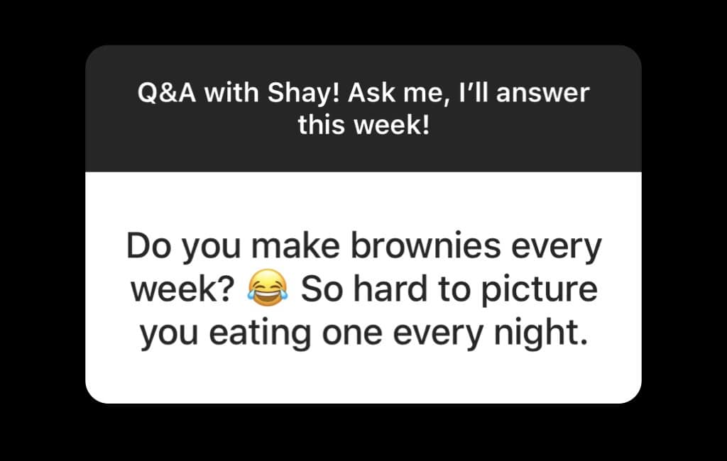 I do! I don’t eat a lot of sweet things (see two questions above), but every night, Andrew and I have a little brownie before bed. It’s like “our thing”.