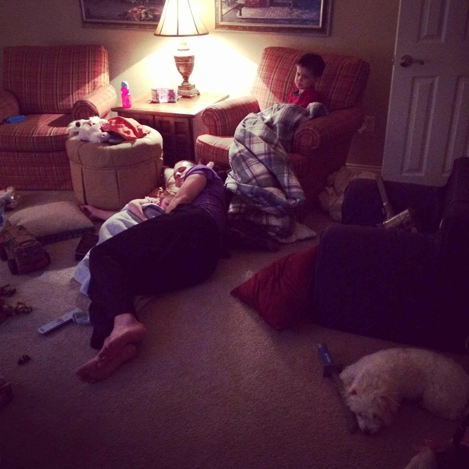 And one final picture…I came home the other night and found them all like this. Play room a mess, everyone tired, and even the dog was exhausted…with her head on a sword. These are my peeps.