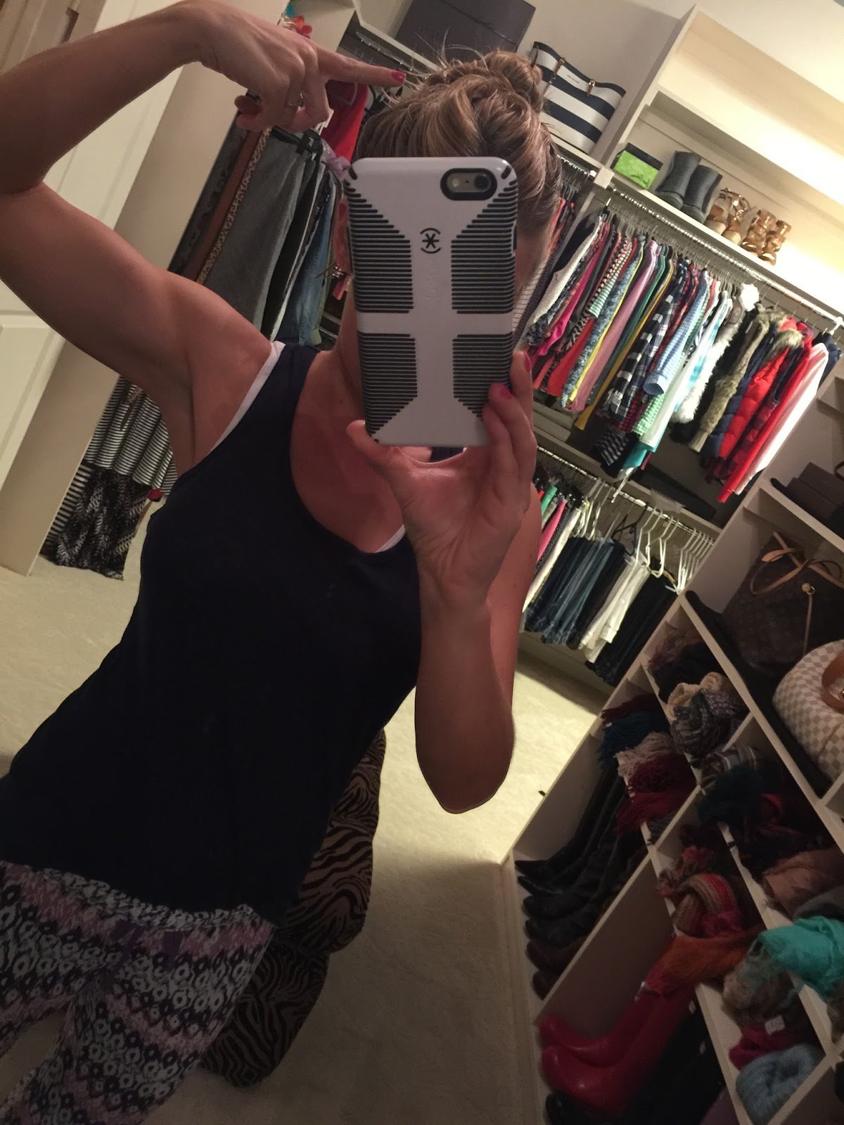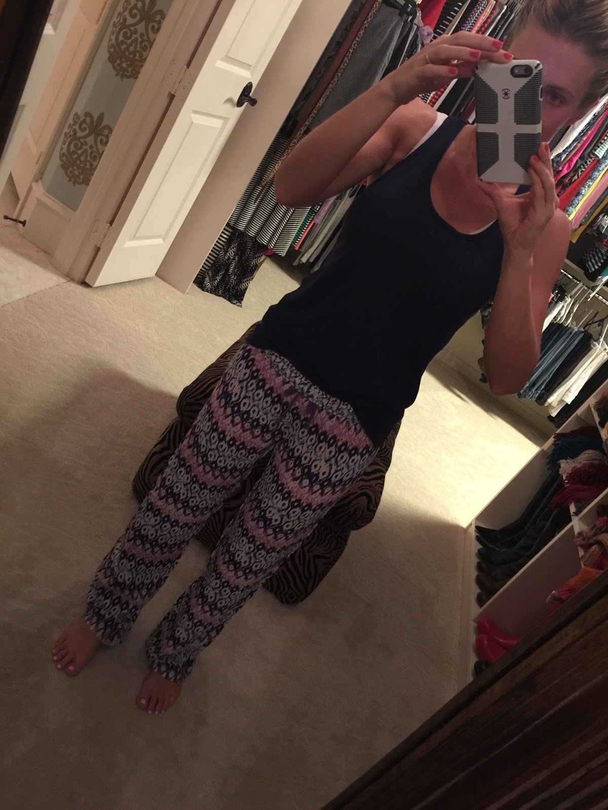 So, hey there…welcome to my closet. This is me…about to go to sleep. I used to sleep in the rattiest tees and sweatpants for years and years until I read Forever Chic a few months ago where the author really encouraged women to take a little more pride in their pajamas…so, I bought me some and you know what? It is nice to wear actual pjs instead of ratty old K-State tees.