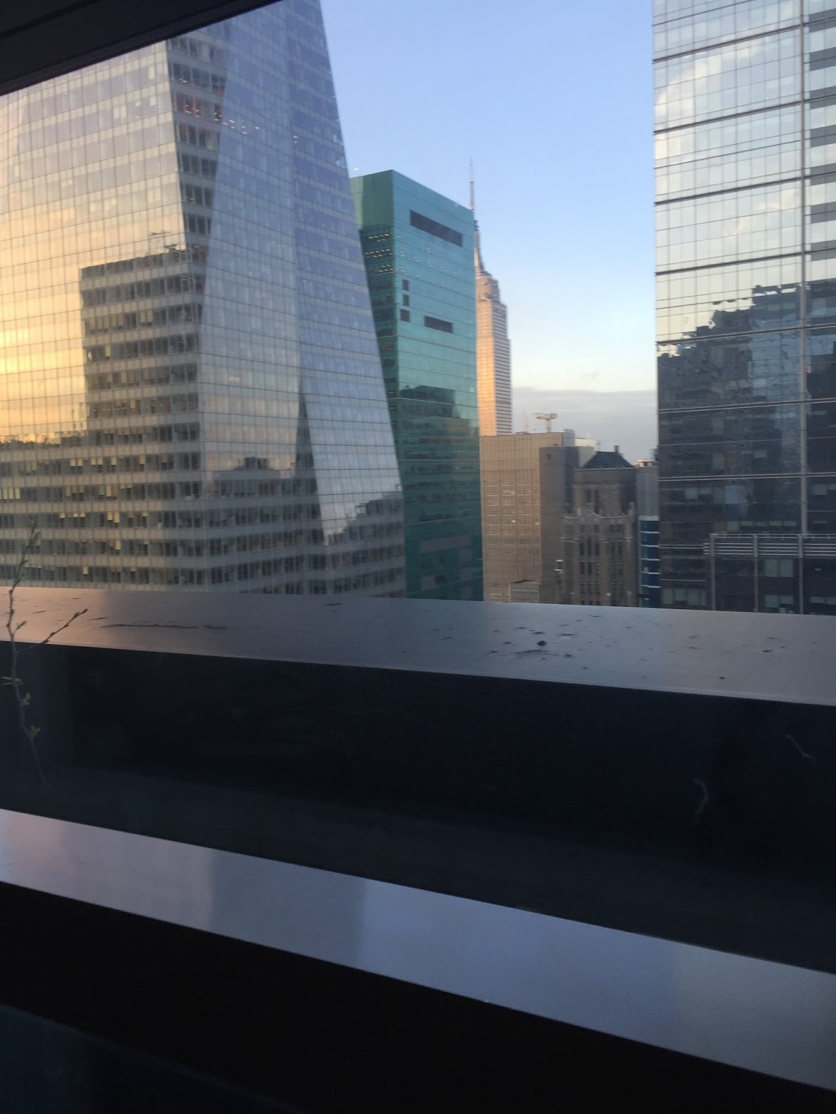 So…Erika and I got up Monday morning and flew to NYC. I have no pictures…hopefully, she does on her blog. We arrived and it was pouring rain and FREEZING. Like legit freezing. We dropped off our bags, added some layers, grabbed our umbrellas and ran across the street from our hotel (The Millennium Broadway) to get a bite to eat. We ate wraps upstairs at this cute little deli and then headed back across the street to the hotel to get into a car and head up to 30 Rock.