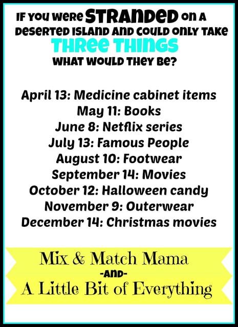 Wednesday’s topic is: What three things would you bring to a deserted island from your medicine cabinet?