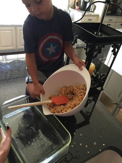 Finally, he poured everything into the baking dish and flattened it into bars.