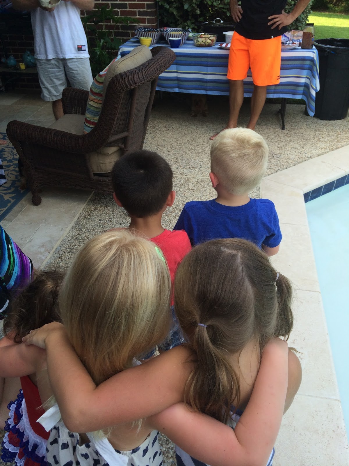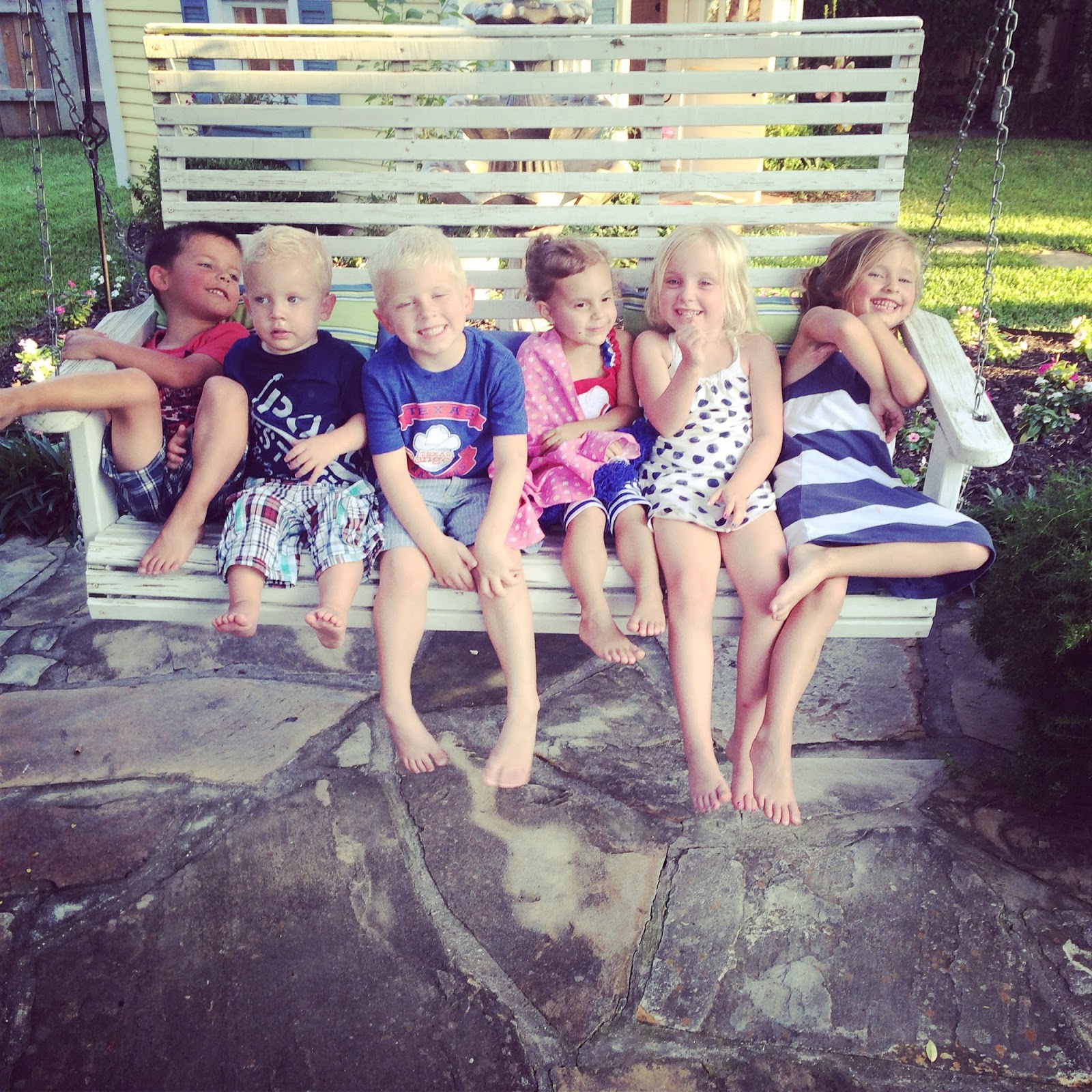 We left the parade and the Slaughters came over to my parents’ house with us for swimming and dinner. We were having so much fun that I left my phone inside and didn’t snap a single picture until it was dinner time. I was standing behind the kids listening to my dad talk about how grateful he was for the men in our family that have served in the military and I looked down and saw these five sweet kids standing there really listening. So sweet :).