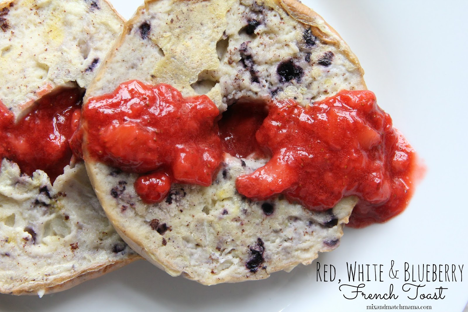I don’t know about you…but over at the Shull house, we’re gearing up for Memorial Day. For me, Memorial Day is the beginning of summer. This year, I thought I would make a festive breakfast to serve my family on Memorial Day (or July 4th too!). It’s a blueberry bagel French Toast with fresh strawberry sauce down over the top. Delish!
