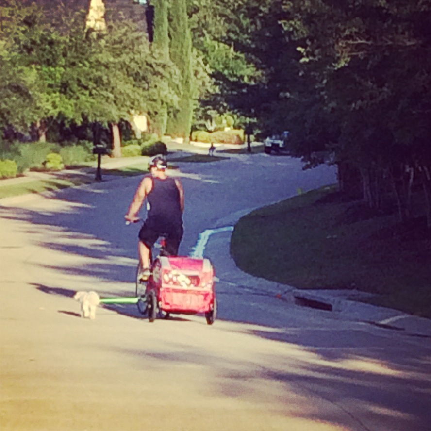 I came home from the grocery store the other evening and saw my whole world on one bike riding down the street. The kids were in the buggy and the dog was on there too. My whole world…on one bike.