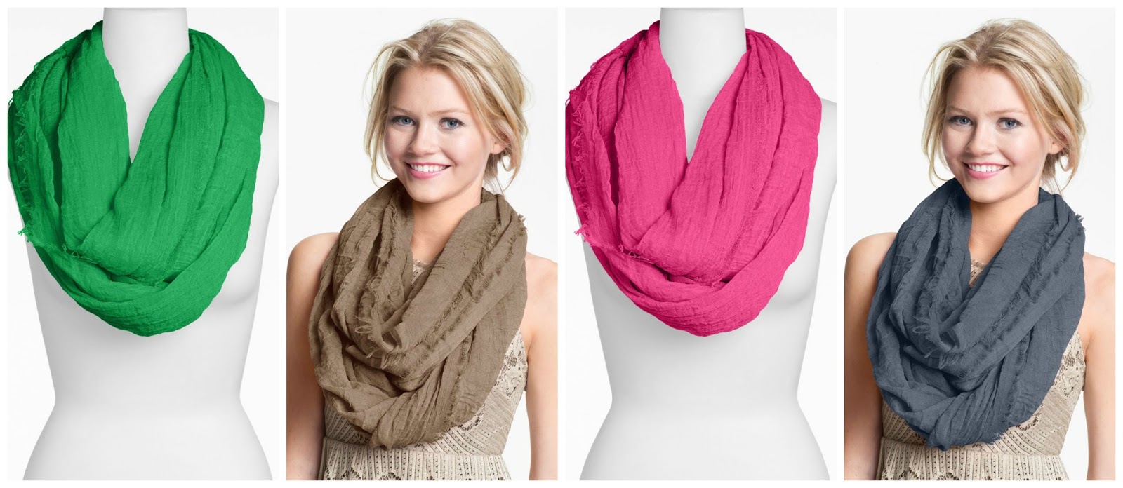 I love these solid scarves that are on sale right now 2 for $38 (and come in 30 different colors!). I went to the mall on Monday and bought the kelly green and khaki colors (but it was a hard decision because I wanted them all!).