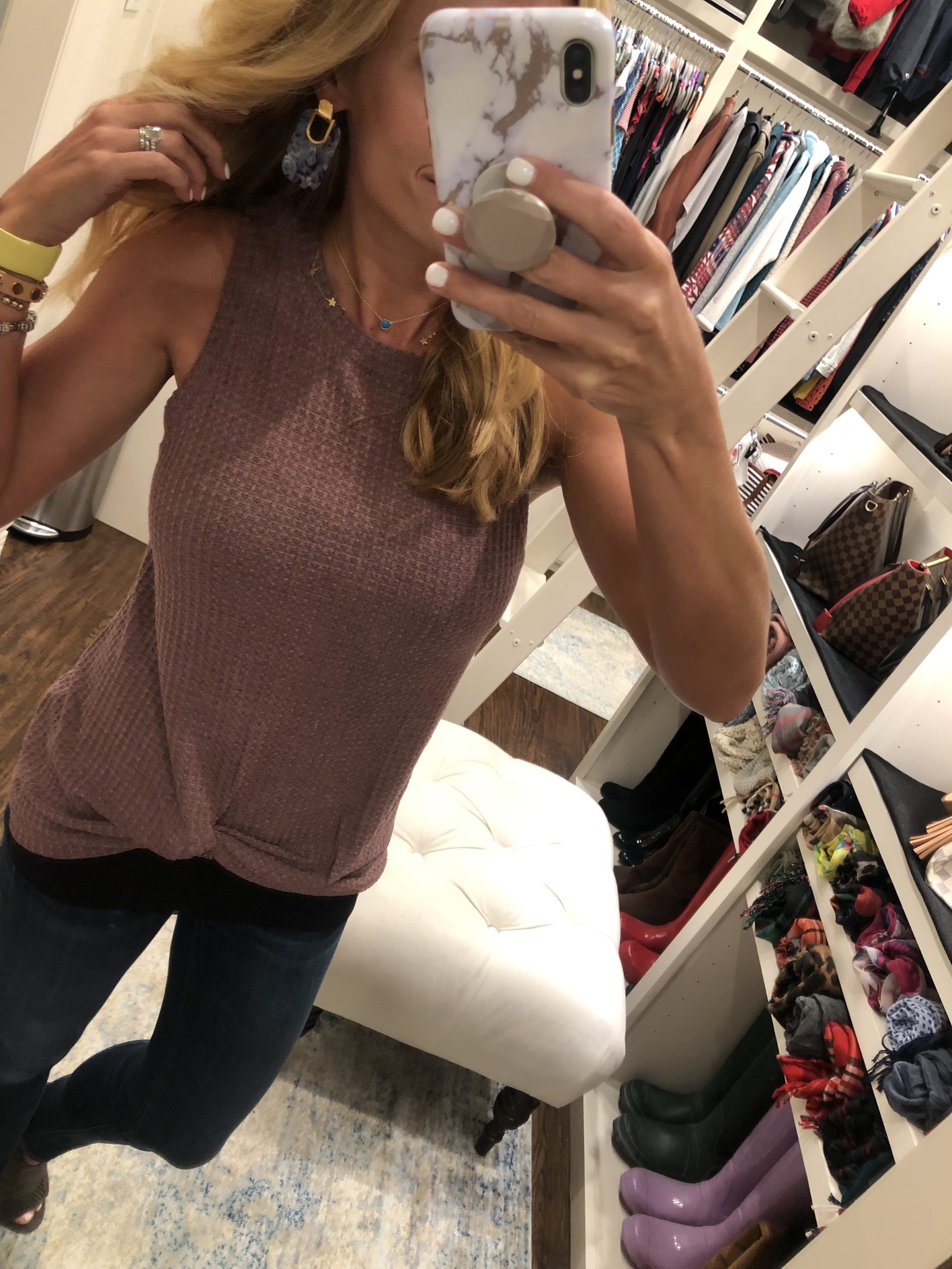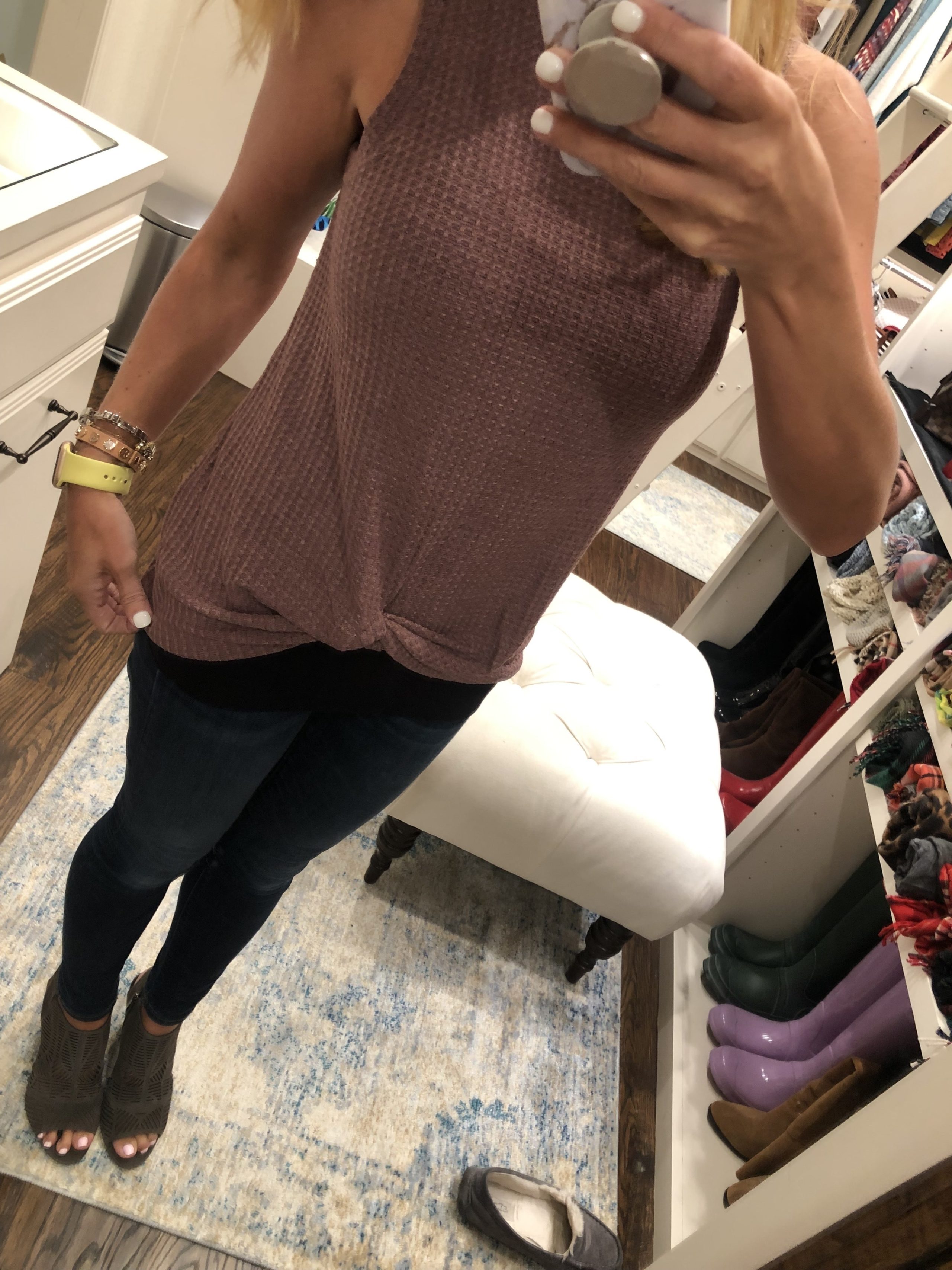 …and she was right! It’s Amazon guys and under $20! Bonus, it comes in a gazillion other colors too (I bought mauve red). The color and the waffle weave look “fall” but the sleeves and the material are light enough for the warm days of September.