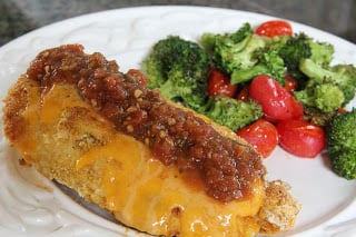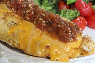 Bake your chicken 20 minutes. Open oven door, sprinkle cheese down the tops of each chicken breast and then pop back in the oven another 5 minutes or until cheese is nice and bubbly.