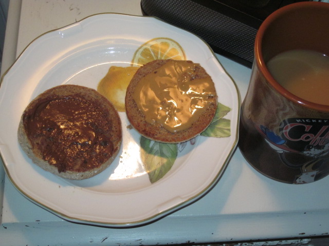 I worked until 7:00…now, I’m on to my second cup of coffee with a whole wheat English muffin for breakfast (one topped with peanut butter and the other with Nutella).