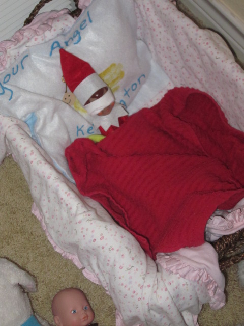 Kensington went and found her Elf. He was napping in her baby’s basket.