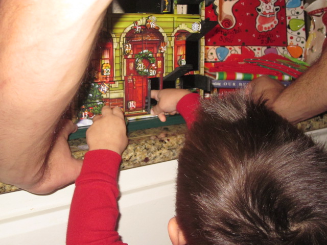 They take turns opening their advent calendar. (Kensington has odd days and Smith even). There are two pieces of chocolate in there…one for each of them. This year, we’re letting them open the calendar in the morning. In our house, morning just makes the day more fun, it’s more exciting and we’re less likely to forget. Yes, they’re having chocolate before 8 AM. No, I don’t care. 🙂