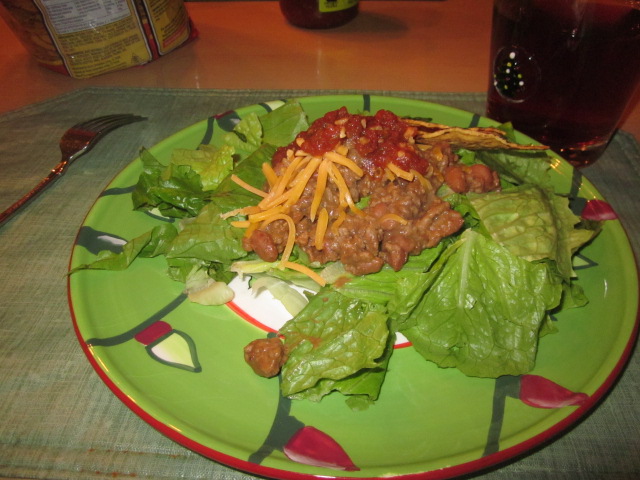 Three nights a week, I make something original for dinner to blog about…2 nights a week, we repeat a meal from the past and then on Friday and Saturday nights, we eat out. This was a repeat night…Andrew’s Taco Salad. Yes, we eat off of Christmas plates and drink out of Christmas glasses this time of year :).