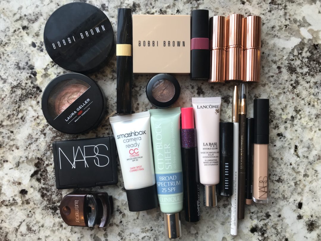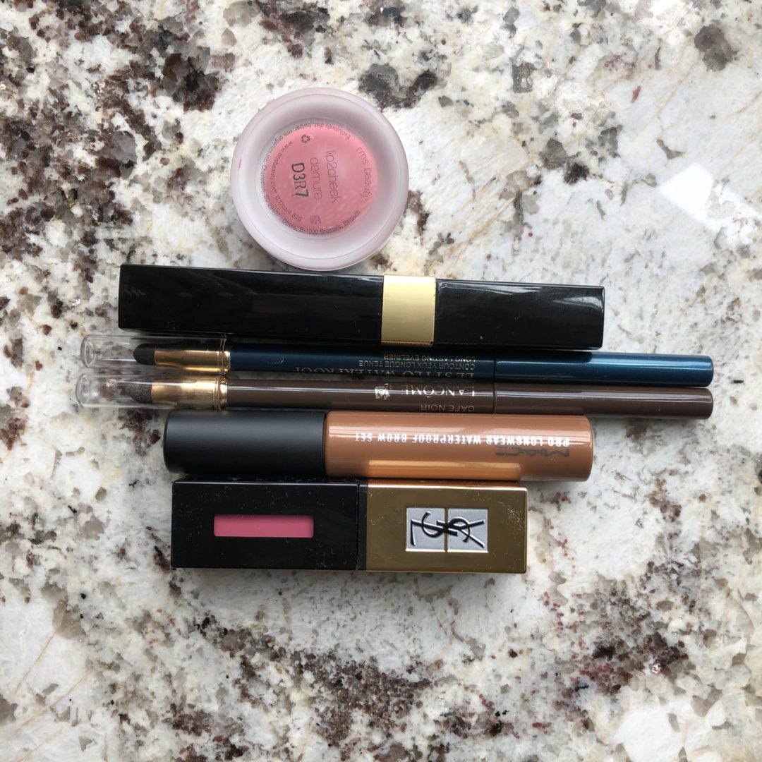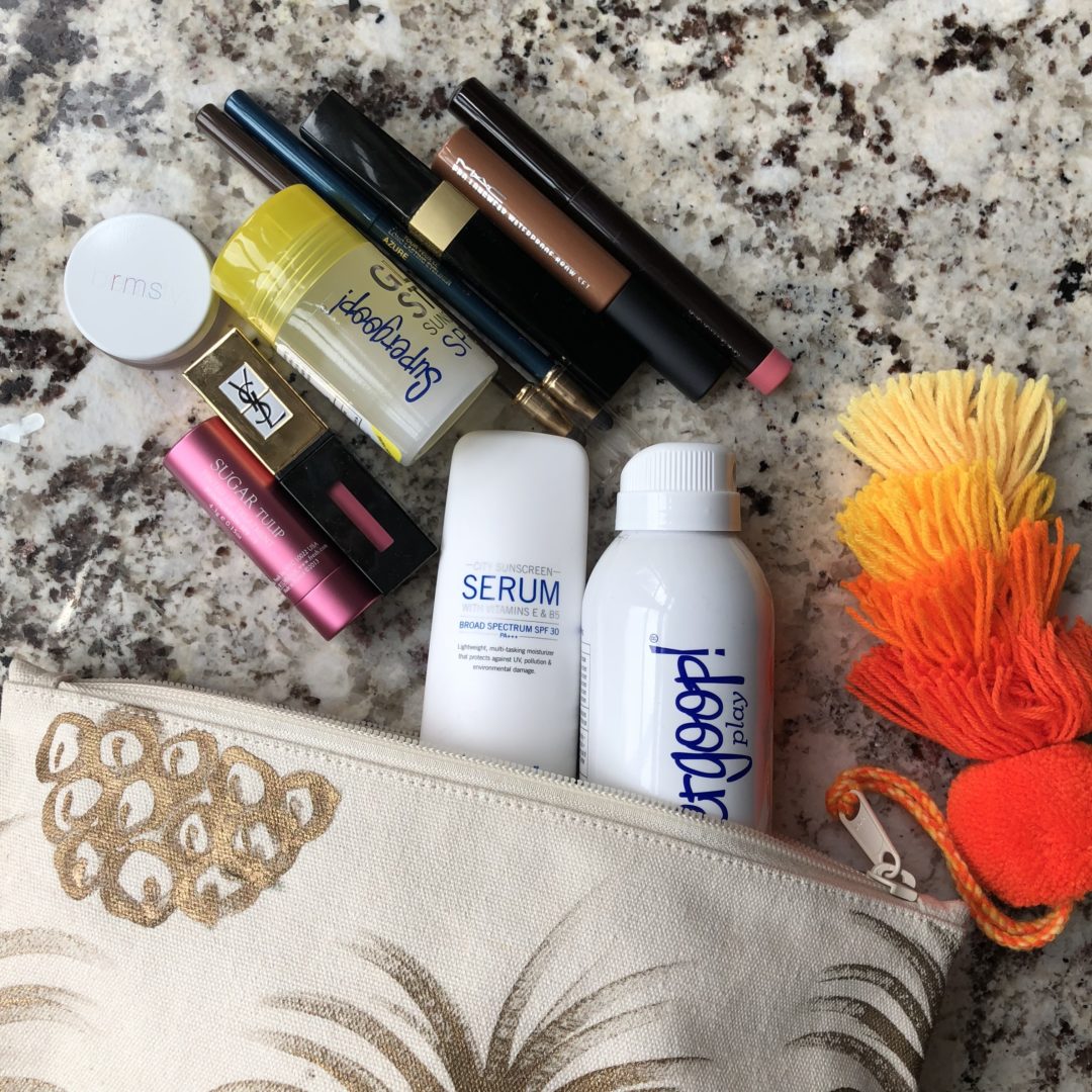 I don’t like to wear a lot of makeup when it gets warm because it makes my skin feel uber yucky, so I try and stick to a few basics like this stuff (in this super cute makeup bag!).