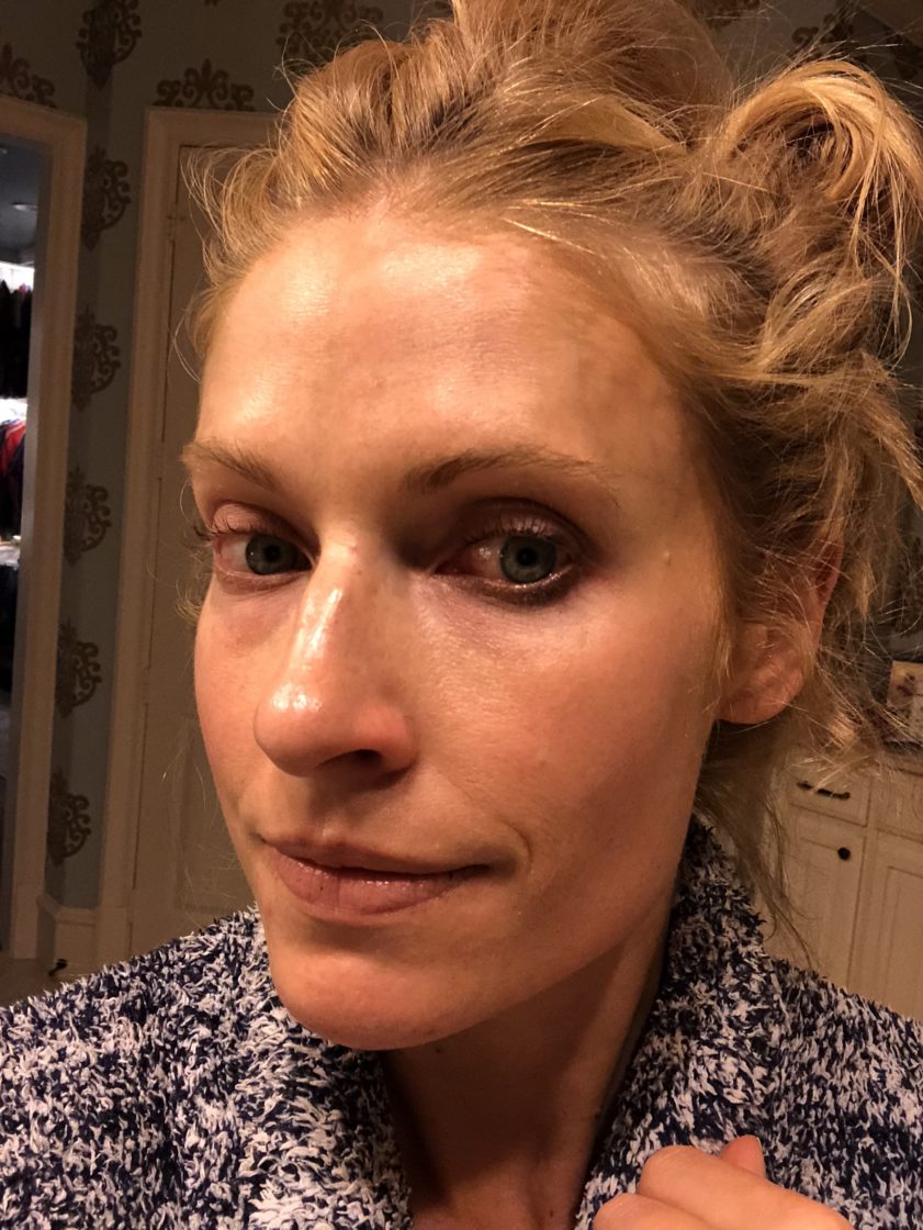 So, I was going to swim with this stuff on so that you could really see the waterproof-ness of it, but that will have to be another post because I haven’t gotten in the pool yet this season. That being said, I did purposely put on just the products above (from the SPF to the makeup) and wore it in the heat all day when Smith had two baseball games. I took an incredibly awkward and horrible pic at the end of the day for you to see…