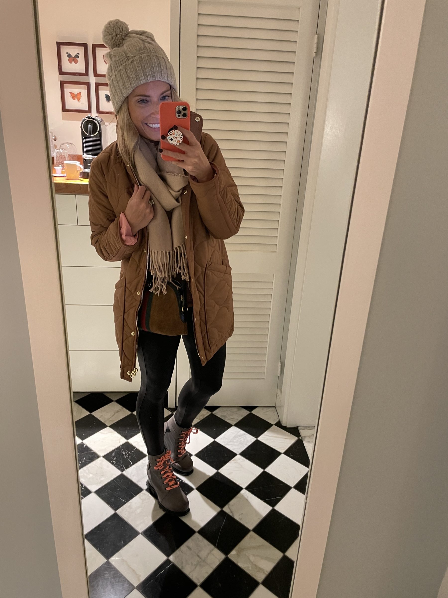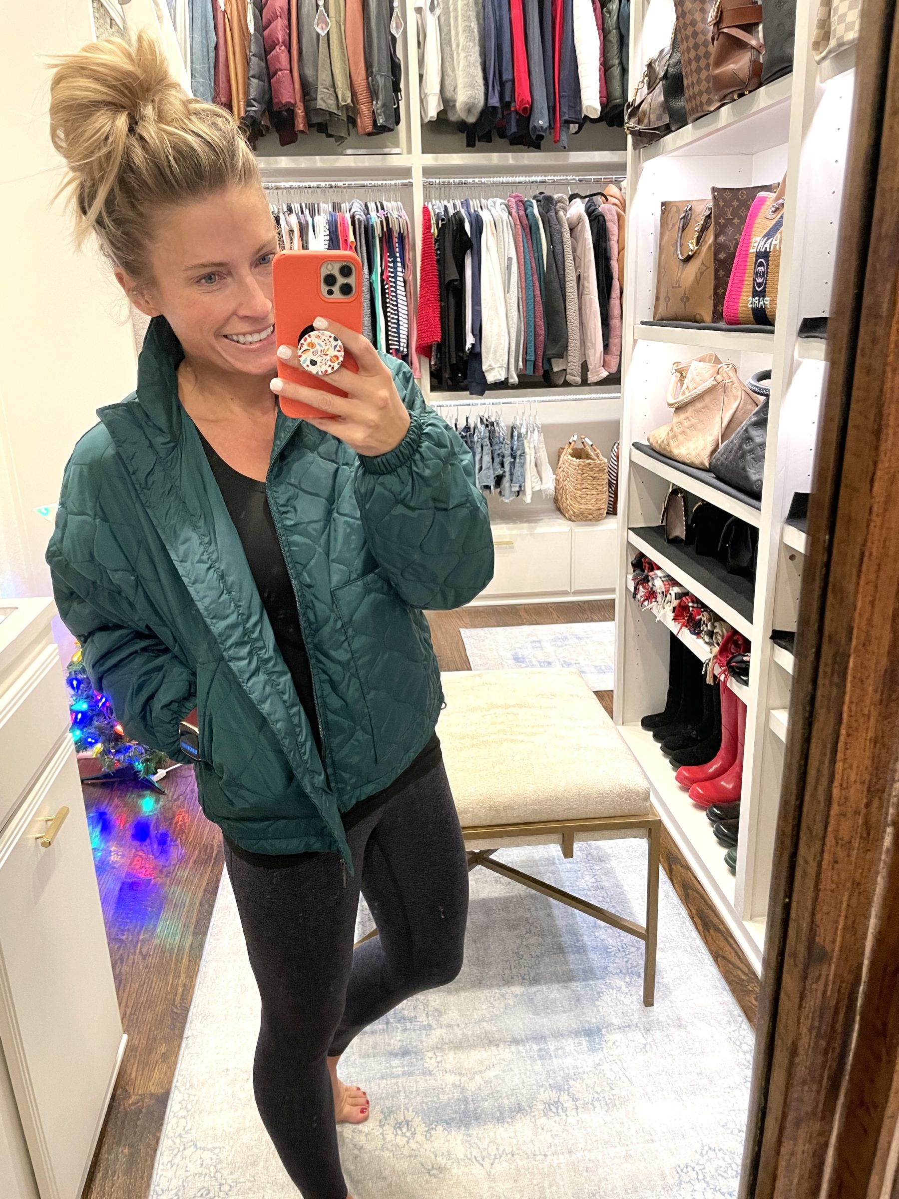 …this time though, I wore it with my new Spanx leggings to run errands! You guys, these new Spanx leggings are rocking my world!! They’re made just like the cult favorite faux-leather ones, but they’re knit. These are warm, the side seams are super cute, they fit great and they make my legging wearing heart super happy. I don’t work out in these leggings, I actually wear them out and about. Love!! I can’t say enough great things about the jacket though. It’s great for rain, for layering, it’s not heavy or bulky…it’s going to be a awesome all season pick for me. I bought it in my TTS (xs), but for the Spanx leggings, I did (per usual with Spanx leggings), size up to a small.