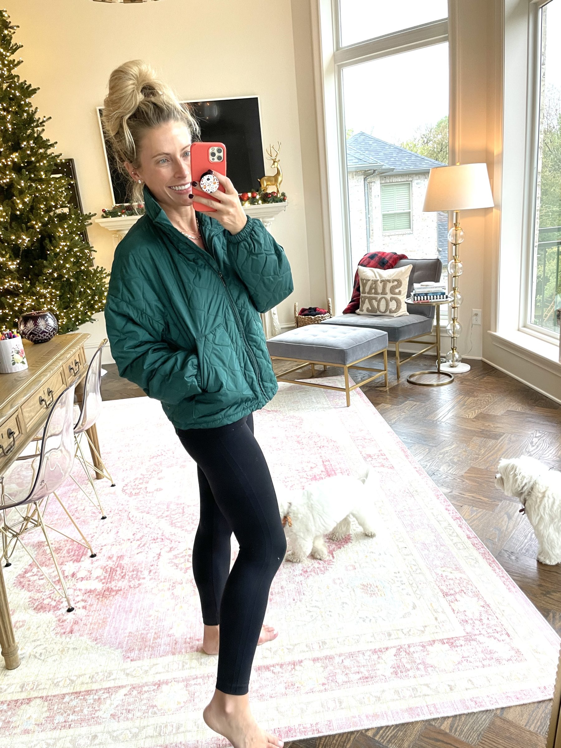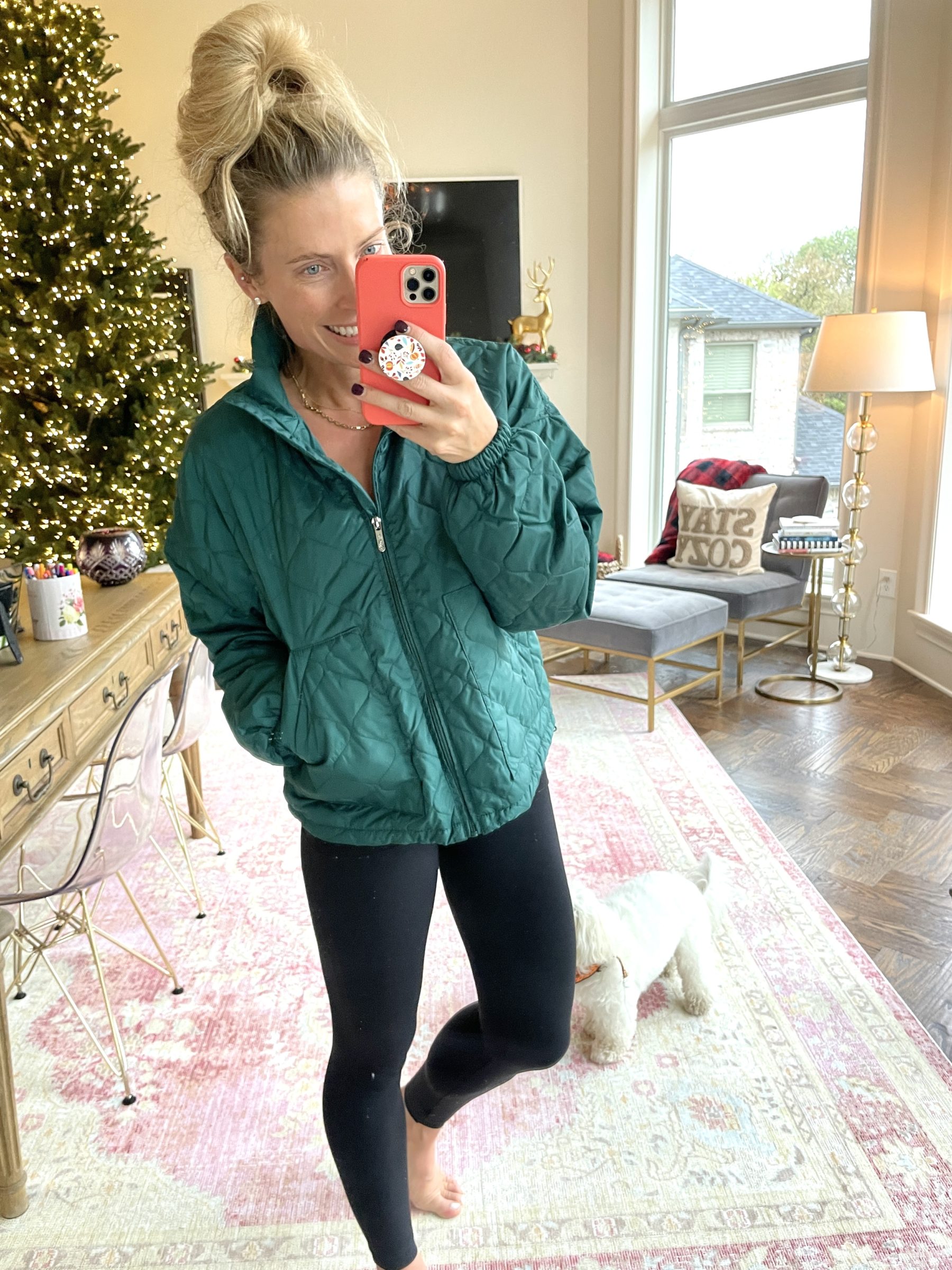 …so cute! They have this light jacket in three other really great colors (including black!), but when I was in the store, they had this green on display and my green-loving heart was swooning! (You all know that green is my favorite color!!) I’m wearing it on this day with my Zella workout leggings after a run…