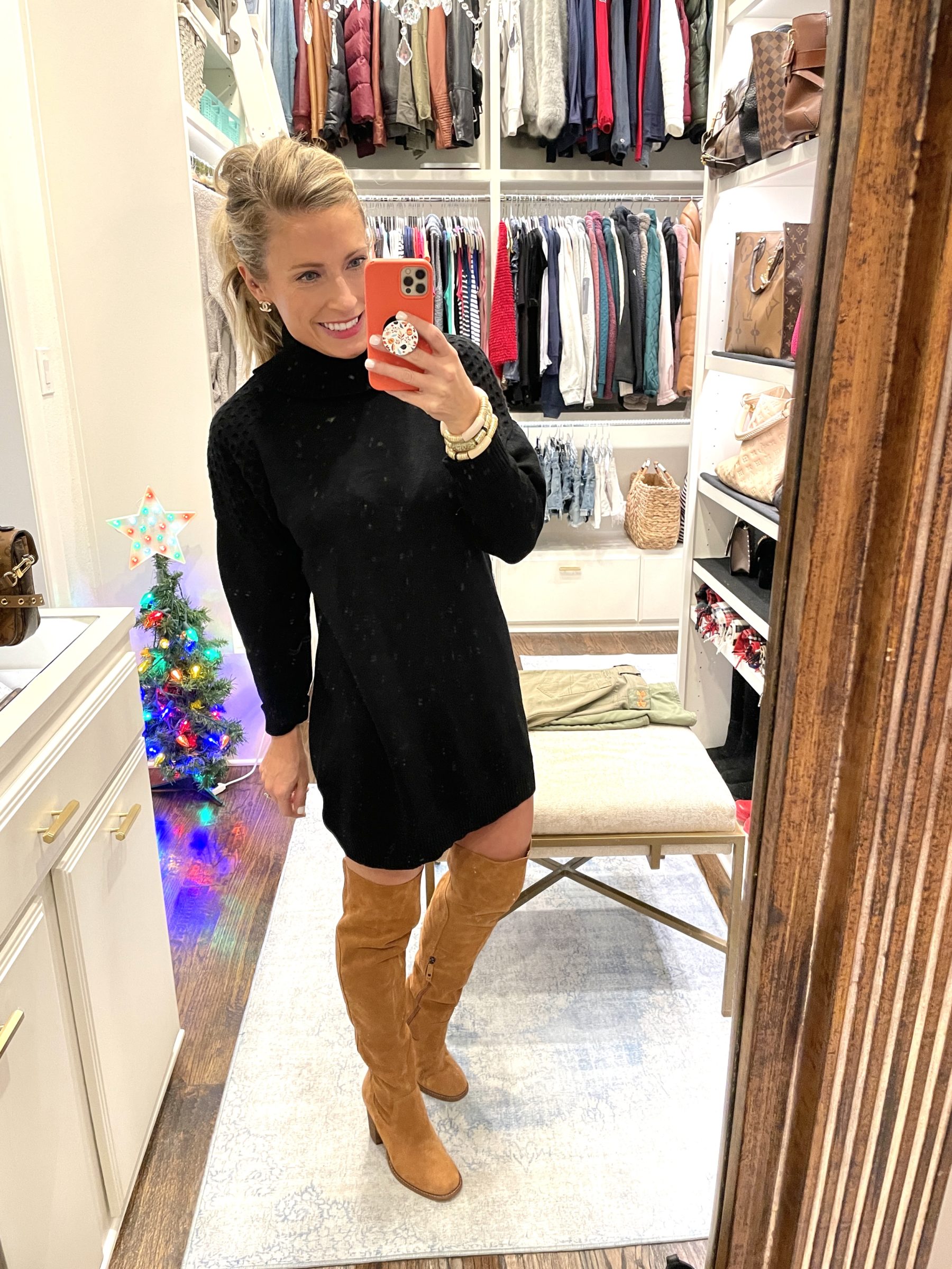 …the easiest little sweater dress perfect for just about every occasion. I paired it with my boots from last year, but these are very similar too (and on major sale!). Also, my lip color is this one here (in dragon girl) that I’ve been telling you about! It’s the perfect pinky-red for the holidays!!