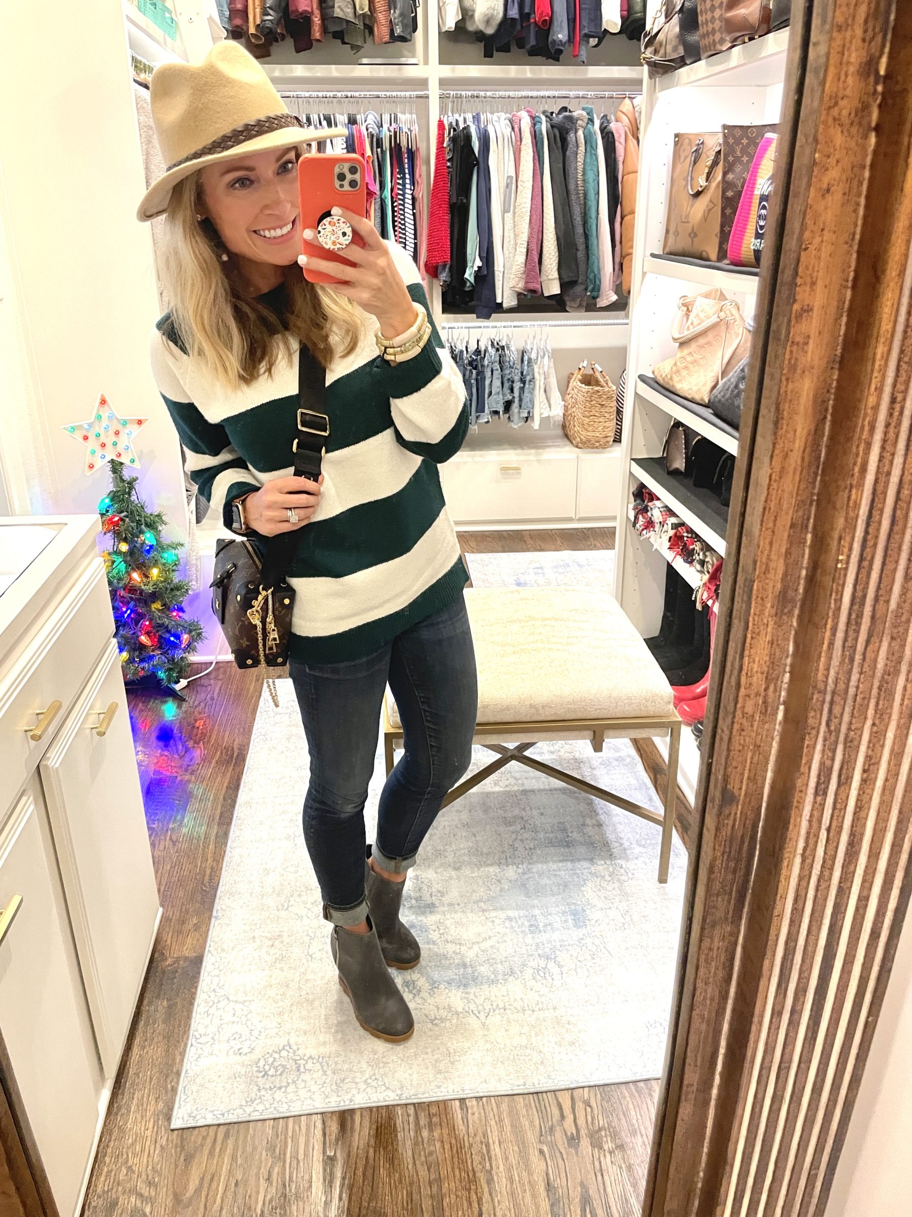 Love your Friday posts! Can you tell me what size you got in the green striped sweater? Also, where did you get the booties you’re wearing with the sweater? What brand?