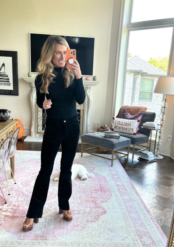 These BOOTCUT CORDUROY PANTS come in SEVEN different colors (I especially loved the eggplant and cognac colors too!) and are like a velvety-corduroy. They seem so much more elevated than other cords I’ve owned in the past. I am always, always looking for different options for pants other than jeans, and I am SO pleased with these! I paired them with THIS TOP and THESE BOOTS.